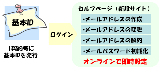 基本IDを使って、セルフページにログインいただくことで、手数料無料にてメールアドレスの作成・変更等をお申込み頂き、即時ご利用頂く事ができるようになります。