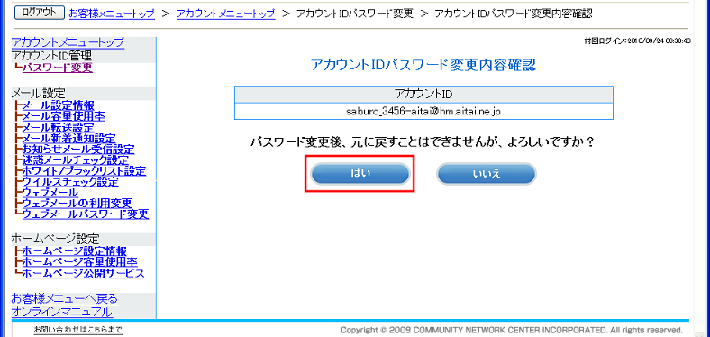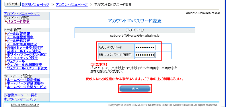 ※現在設定されているパスワードと入力されたパスワードが同じ場合、エラーとなってしまいます。大変お手数ですが、一度別のパスワードに変更された後、再度現在のパスワードへ変更していただきますようお願いします。