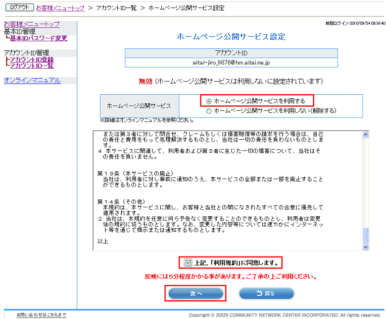 利用規約に同意頂き、チェックボックスをオンにします。その後、「次へ」ボタンで進みます。