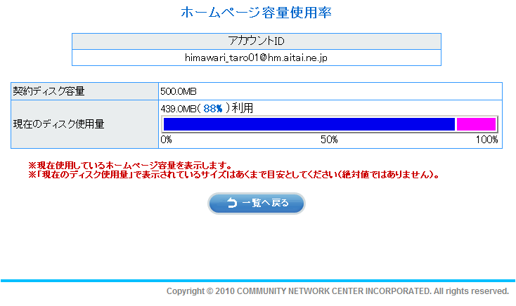 2. アカウントメニューのホームページ容量使用率をクリックします