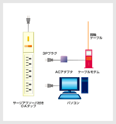 「サージアブソーバ付OAタップ」を使用し、ケーブルモデムとパソコン機器の電源コンセントを、同じ「サージアブソーバ付OAタップ」に接続することで、雷サージによりケーブルモデムやパソコン機器などが破壊される確率を減少することができます。
